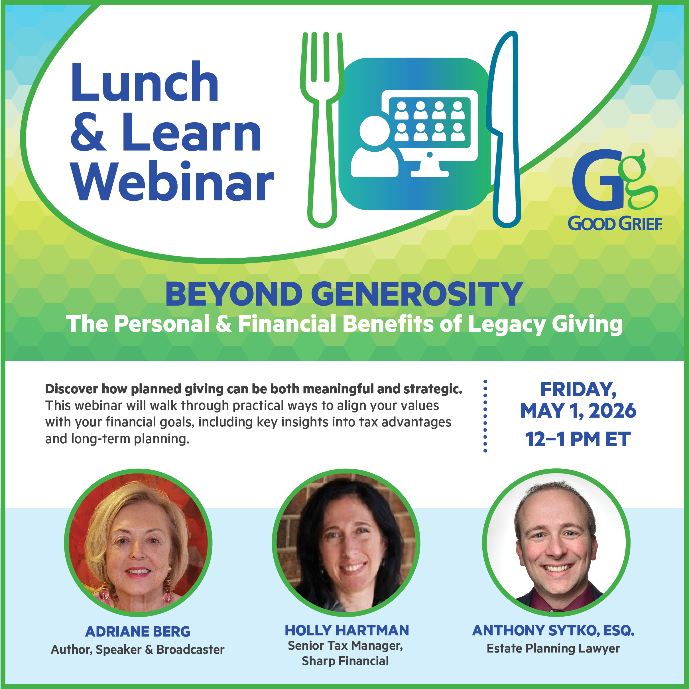 Discover how planned giving can be both meaningful and strategic. This webinar will walk through practical ways to align your values with your financial goals, including key insights into tax advantages and long-term planning. Hear from Adriane Berg, Author, Speaker & Broadcaster; Holly Hartman, Senior Tax Manager at Sharp Financial; and Anthony Sytko, Estate Planning Attorney, as they share expert guidance to help you make informed decisions for your future.